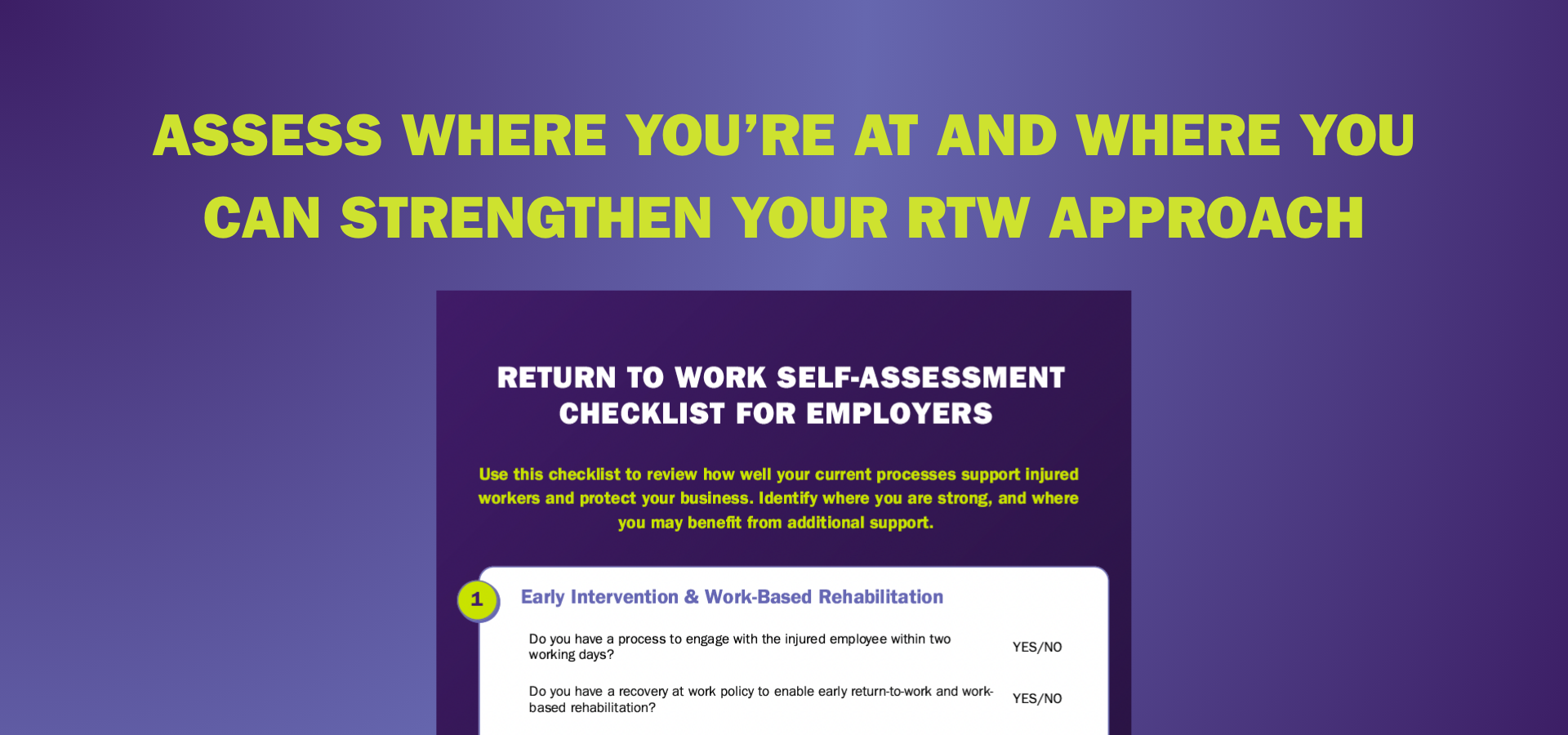 This checklist will help you review how well your current processes support injured workers and protect your business. You'll be able to identify where you are strong, and where you may benefit from additional support.